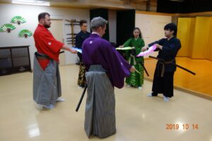 After watching the video, I attended the lesson of Kembu. The instructor of Samurai Kembu is so friendly. He trained and other custoemers how to receive the sword, to bow, draw a samurai sword, and strike with sylized movements.