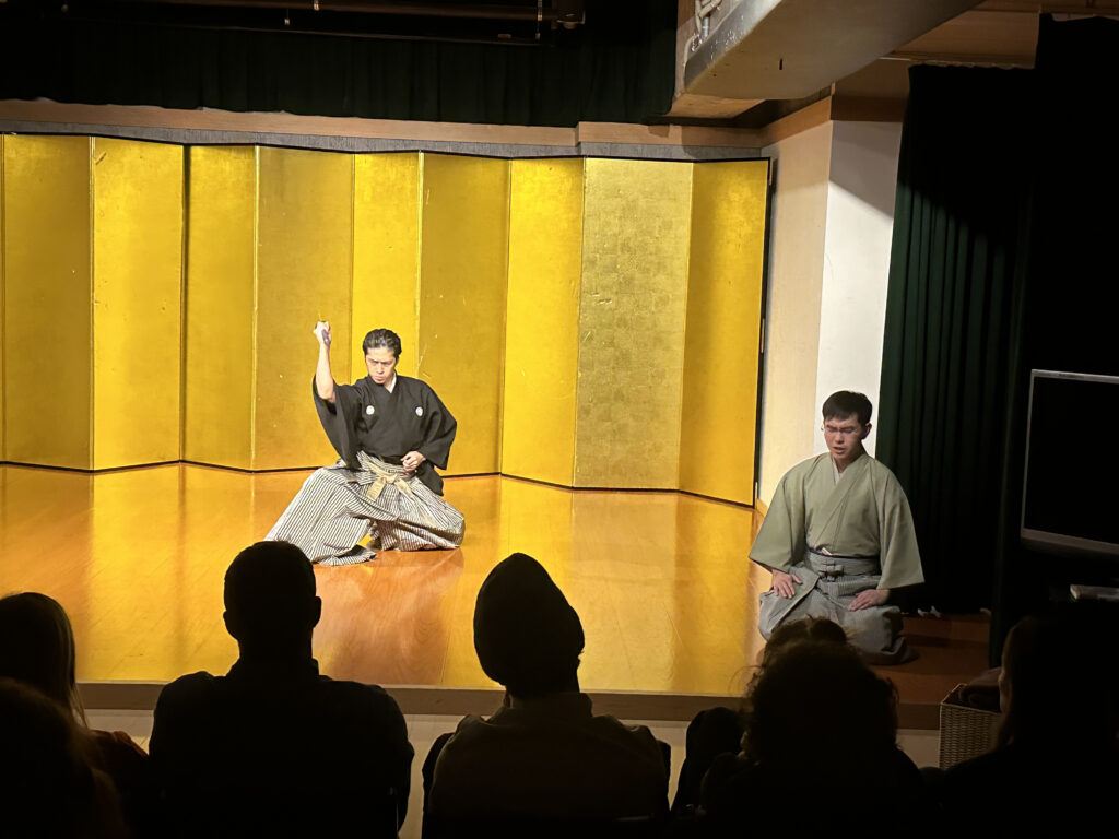 This was especially clear during a performance at Samurai Kenbu Theatre where shigin was delivered live by a professional reciter. Subtle shifts in breath and emphasis directly influenced the pacing and quality of movement. Transitions lengthened or tightened, gestures sharpened, and focus deepened in response. The audience, too, felt this exchange, with vocal intensity guiding attention and emotional engagement.